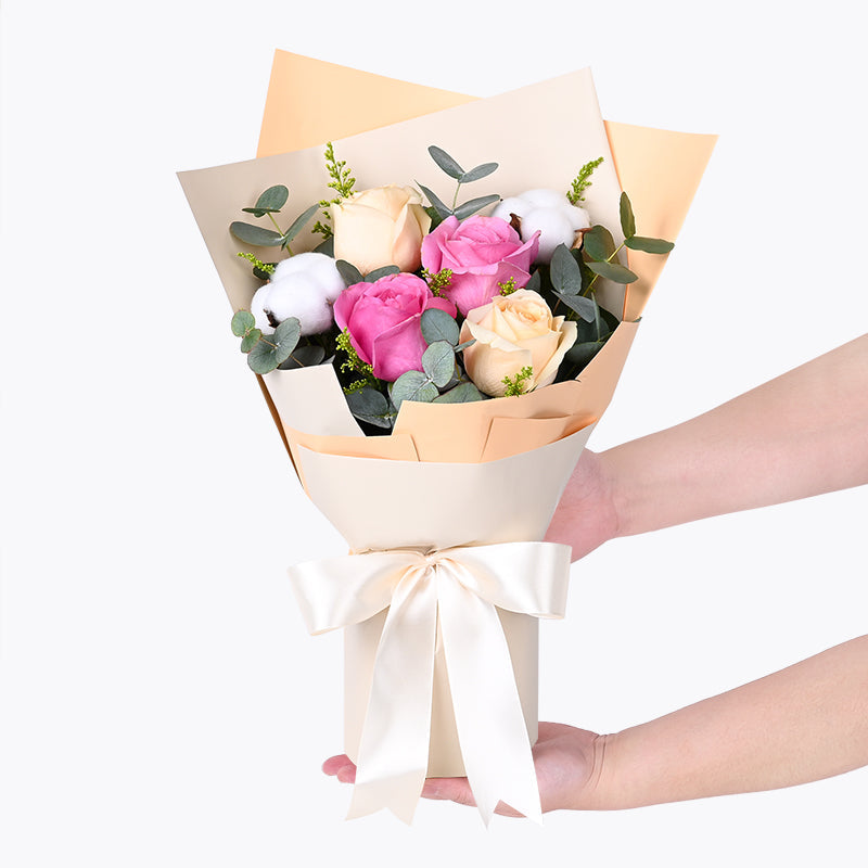 Transport your special someone to a land full of pure romance, with soft pink and champagne roses & pops of white cotton flower. Make their day a dream come true, with our sweet and salubrious Cloud Nine flower bouquet, handcrafted to make your love bloom.