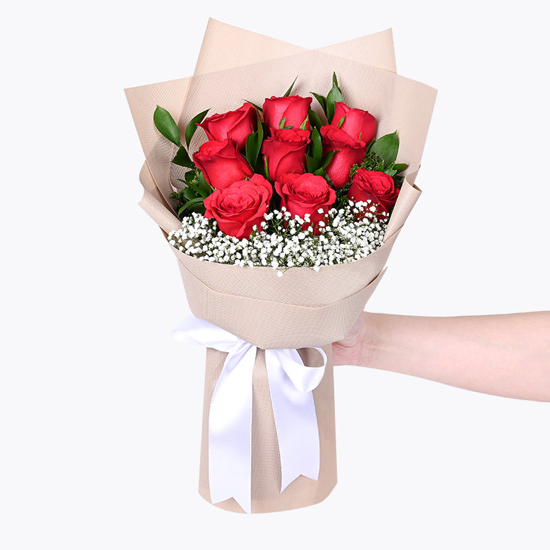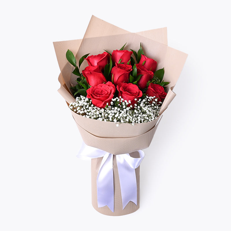 Express your genuine love with these nine carefully arranged red roses, surrounded with an elegant wrapping and ribbon.