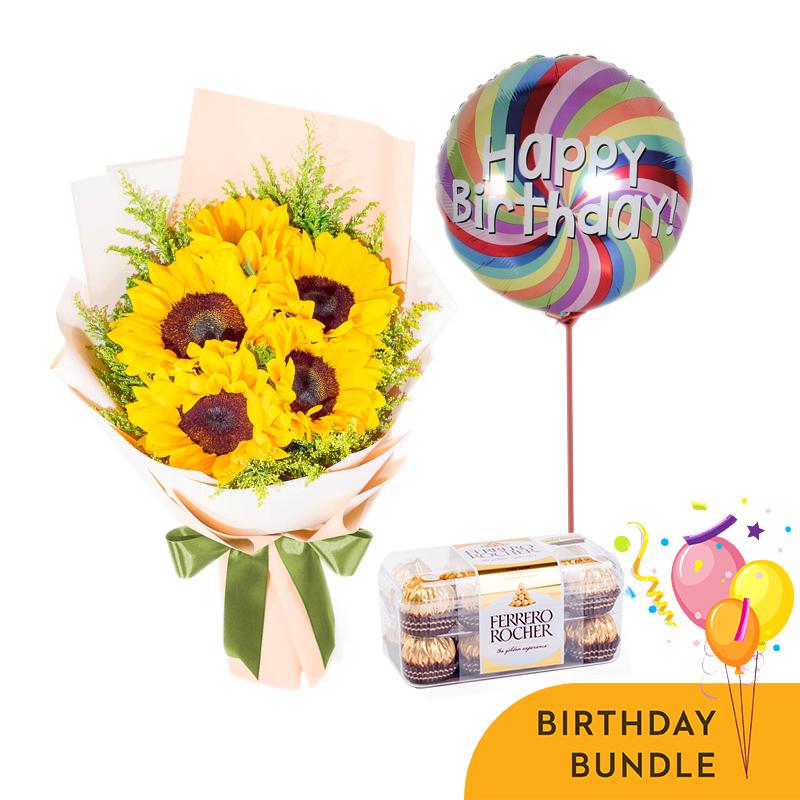 Get the party started, brighter than ever before with our Bloomy Days Birthday Bundle. The bundle even comes with decadent Ferrero Rocher and a bright birthday balloon! If you are looking to make a lovely statement, send this today!