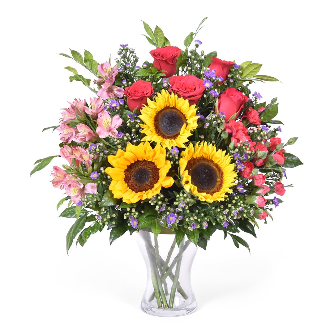Red Roses (4 Stalks), Shocking Pink Roses (4 Stalks), Maria Pink Roses (4 Stalks), Pink Carnation Spray (2 Stalks), Eucalyptus Leaves