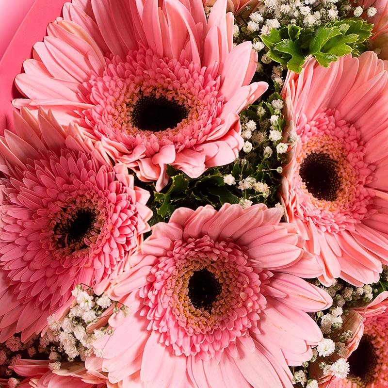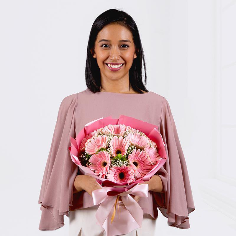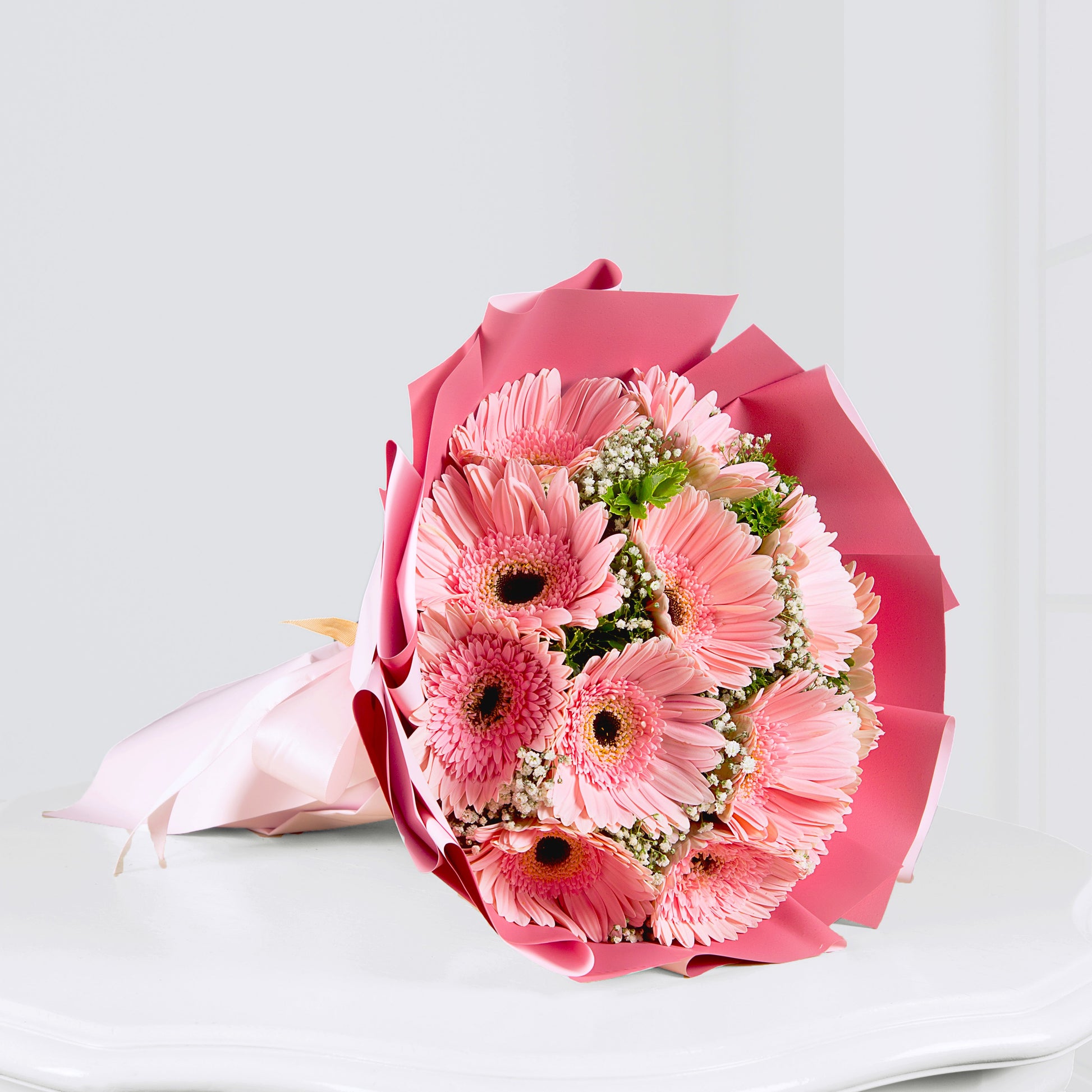 Beautiful pink Gerbera bouquet with fancy wrapping. Consists of 12 fresh Gerbera stalks. Gerbera flowers grow in a bright and beautiful place. And this is reflected from their own look. Rather than giving a red Rose, this Gerbera is perfect to be given to a neighbor, siblings or grandmother.