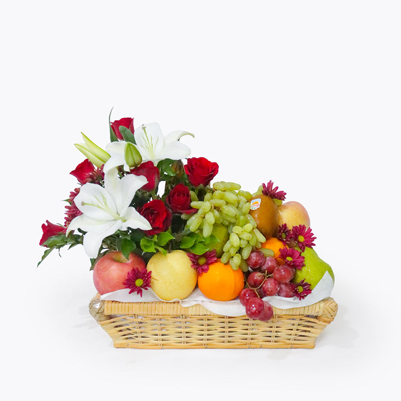 Garden Basket is an abundant fruit basket that’s bursting with its generous selection of green pears, red apples, more pears, vibrant oranges, tangy kiwi, and a mix of red and green grapes. A white lily adds a touch of serenity, while red roses convey deep affection. The tea leaves completes the arrangement, symbolising growth and renewal. This basket is perfect for inspiring energy and enthusiasm in anyone who receives it.