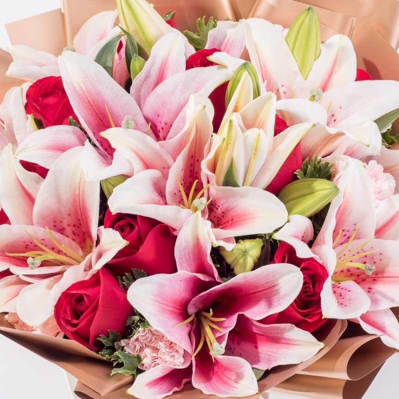 Red Roses (10 Stalks), Pink Lilies (4 Stalks), Pink Carnations (5 Stalks)