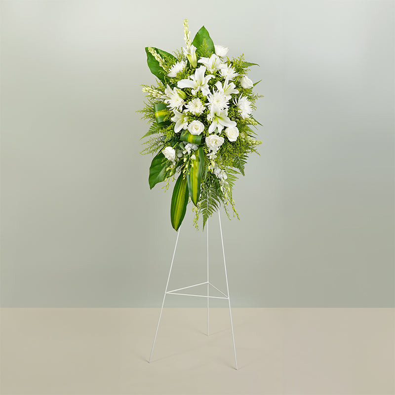 A wonderful condolence stand for funeral services. Lush flowers, compiled in an extraordinary style make this arrangement one of our bestsellers.