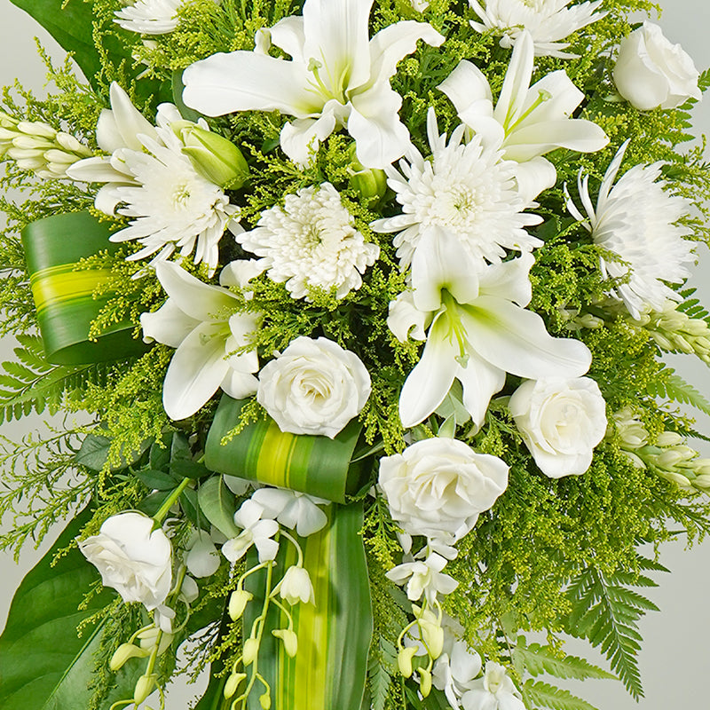 White Lily (3 Stalks), White Orchid (5 Stalks), White Rose (5 Stalks), White Spider Mum (6 Stalks), White Tuberose (5 Stalks), Yellow Peacock (5 Stalks), Iron Leaves