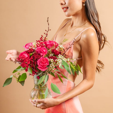 Shocking Pink Rose (5 Stalks), Maroon Carnation (5 Stalks), Red A Jones/James Story/ Friendship Orchid (1 Stalk), White Wax Flower (1 Stalk), Seeded Eucalyptus
