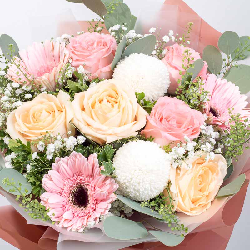Pink Roses (3 Stalks), Champagne Roses (3 Stalks), Pink Gerbera (3 Stalks), White Ping Pong (2 Stalks), White Baby Breath, Eucalyptus Leaves, Green Bell